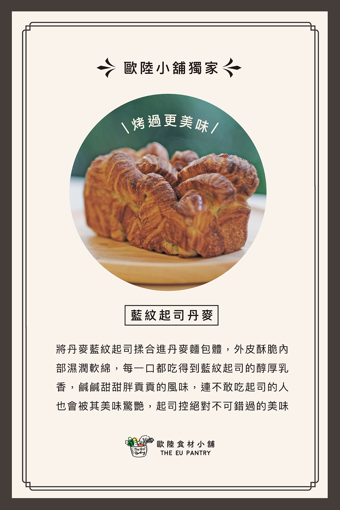 1. 歐陸小舖獨家研發,選用丹麥藍紋起司融入麵團中,外皮酥脆內部綿軟,帶有獨特的藍紋起司的醇厚乳香,推薦給喜歡起司或想嘗試藍紋的你