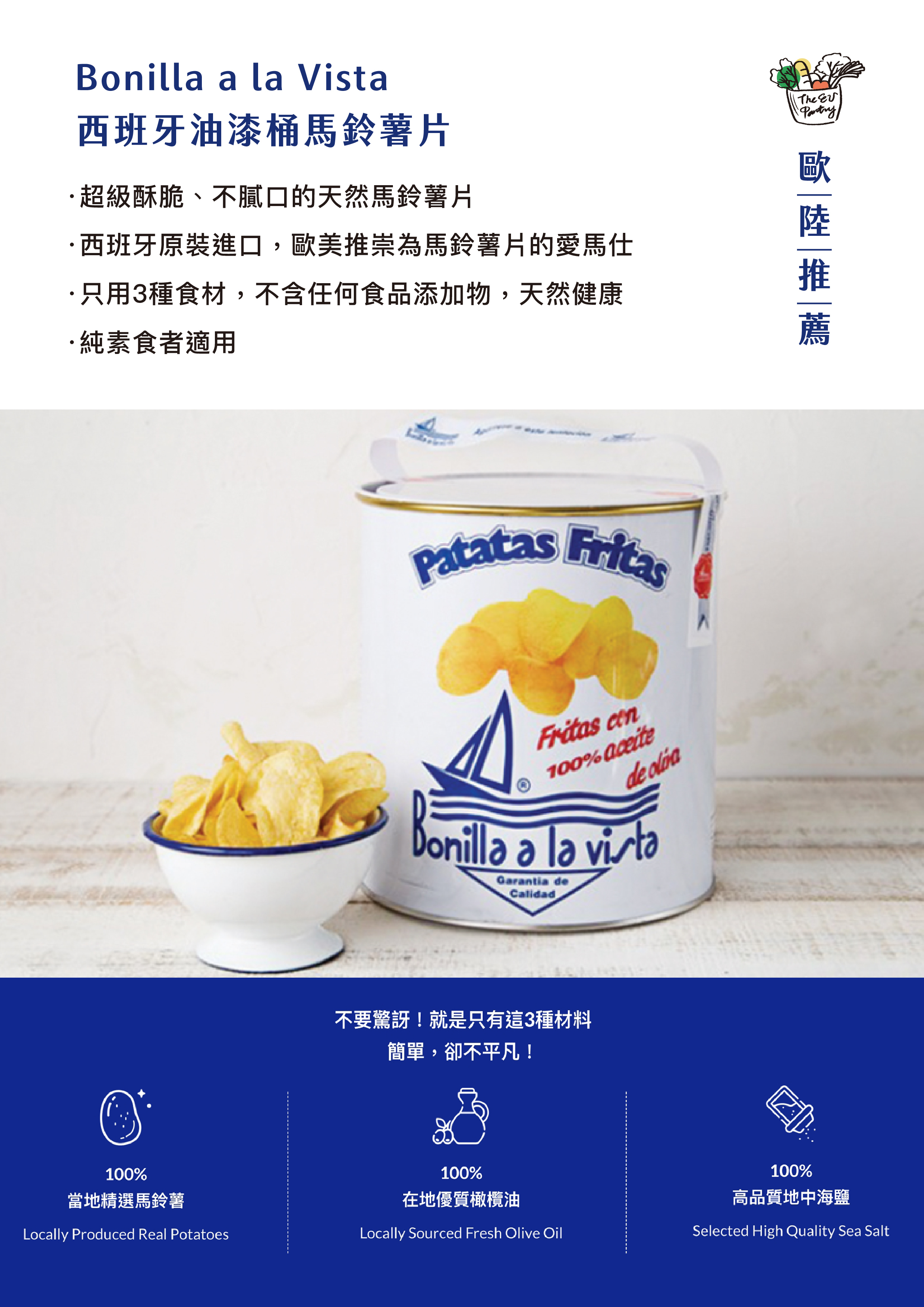 Bonilla a la Vista 是西元 1932 年在西班牙的費羅爾 (Ferrol) 這個海港開始,一位叫做 Salvador Bonilla 的故事。Salvador 是一位水手,十分渴望的可以在他的海上旅程中吃馬鈴薯片,但是受不了當時市面上的馬鈴薯片因為在潮濕的海洋環境下快速的受潮、變軟、變質。因此,他想到了使用西班牙當地的馬鈴薯、在地的橄欖油以及海鹽,開發了超級酥脆又不膩口的天然馬鈴薯片 Bonilla a la Vista 品牌,並使用油漆罐,一個可重複使用且密封的保存環境,讓每一口的薯片吃起來都是如此酥脆。