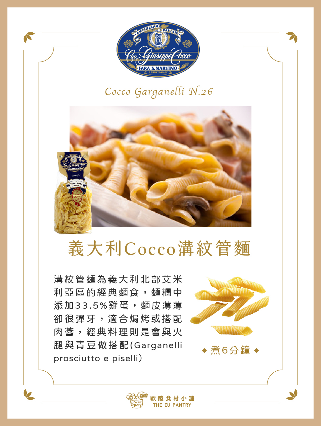 Cavalier Giuseppe Cocco是一間家族經營的義大利麵公司,位於義大利中部阿布魯佐大區法拉聖馬蒂諾 Fara S.Martino Abruzzi創立於1940年,為義大利公認工匠級、最優質高貴的義大利麵之一