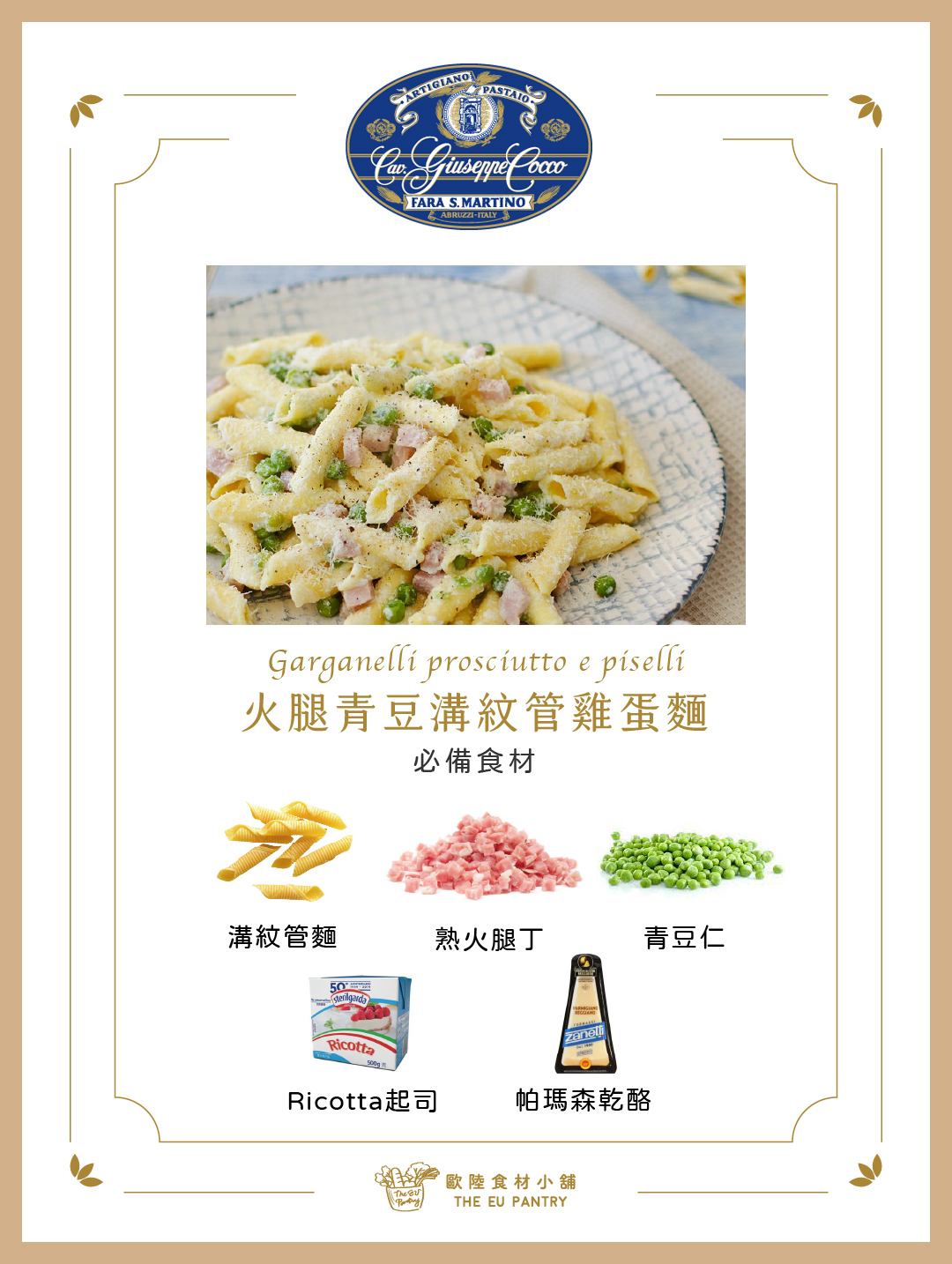 古法製作工匠等級,麵糰中添加雞蛋增添風味和彈性,麵皮薄而表面有溝紋的管狀麵,適合焗烤或搭配肉醬,煮6分鐘