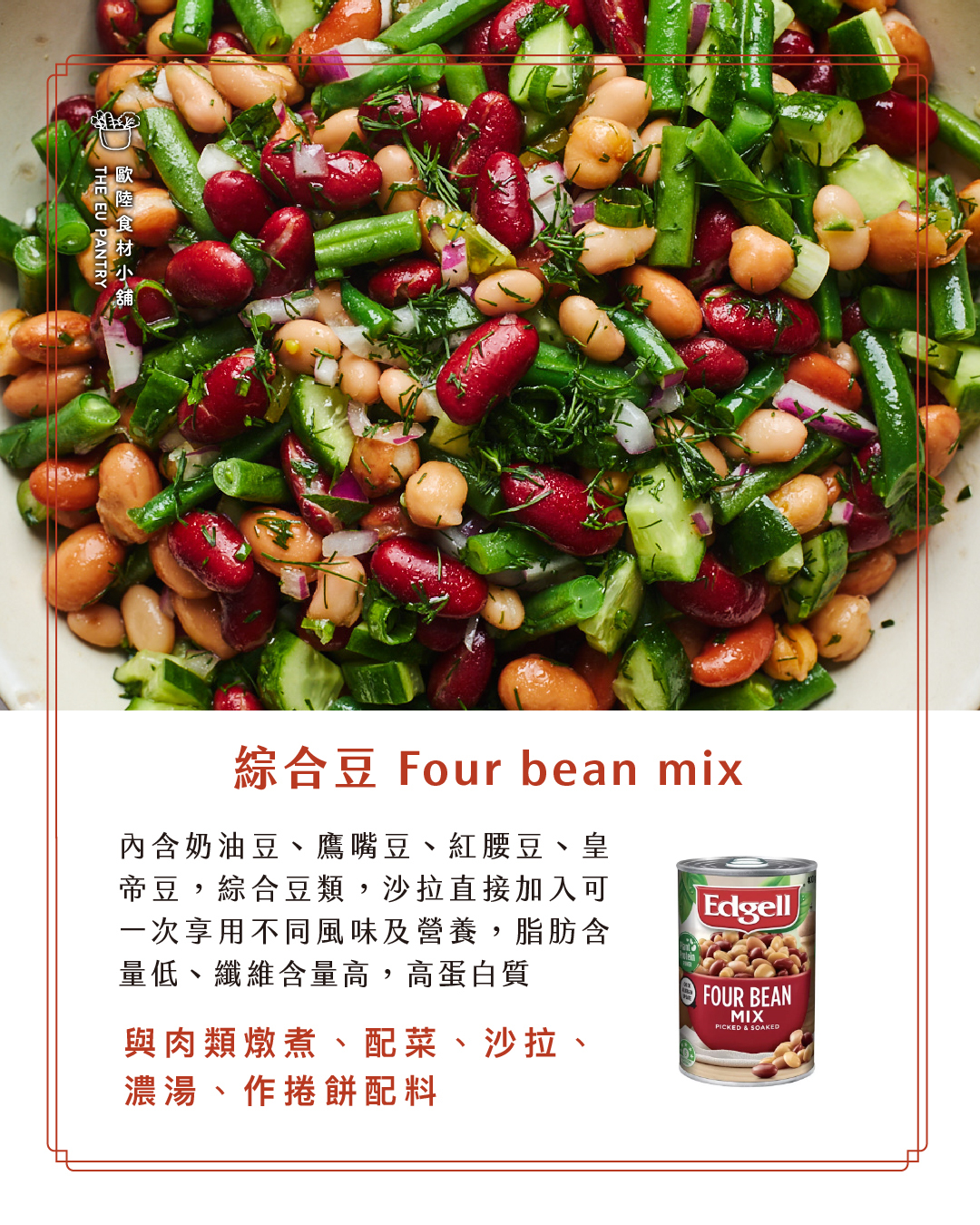 成分:白豆、鷹嘴豆、紅腰豆、皇帝豆、水、糖、鹽、氯化鈣、醋酸