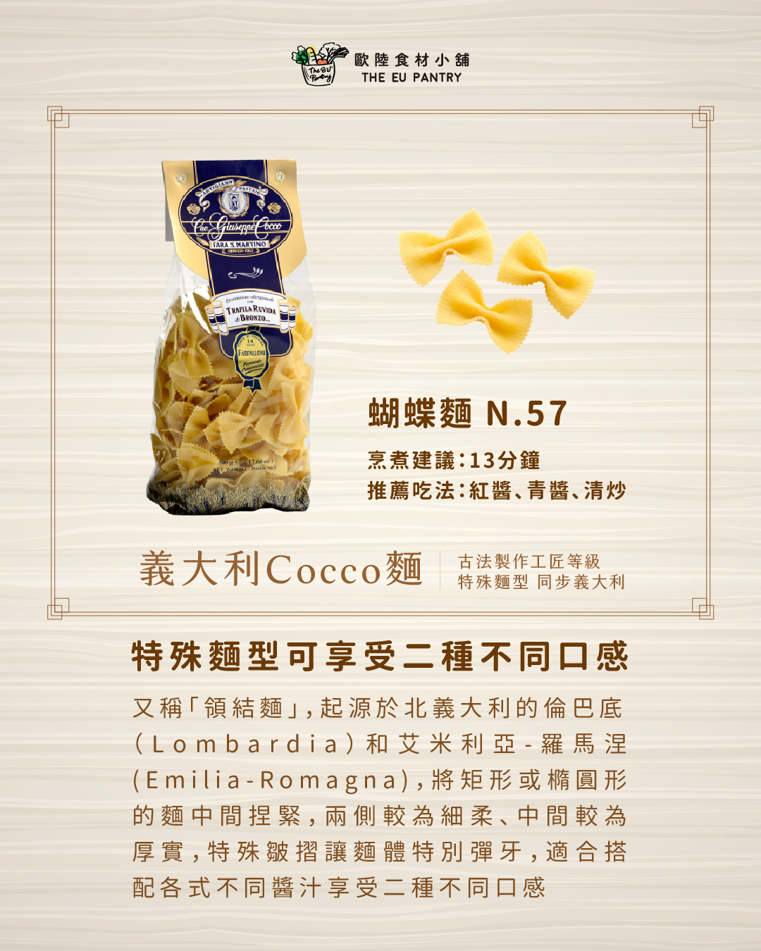 Cavalier Giuseppe Cocco是一間家族經營的義大利麵公司,位於義大利中部阿布魯佐大區法拉聖馬蒂諾 Fara S.Martino Abruzzi創立於1940年,為義大利公認工匠級、最優質高貴的義大利麵之一