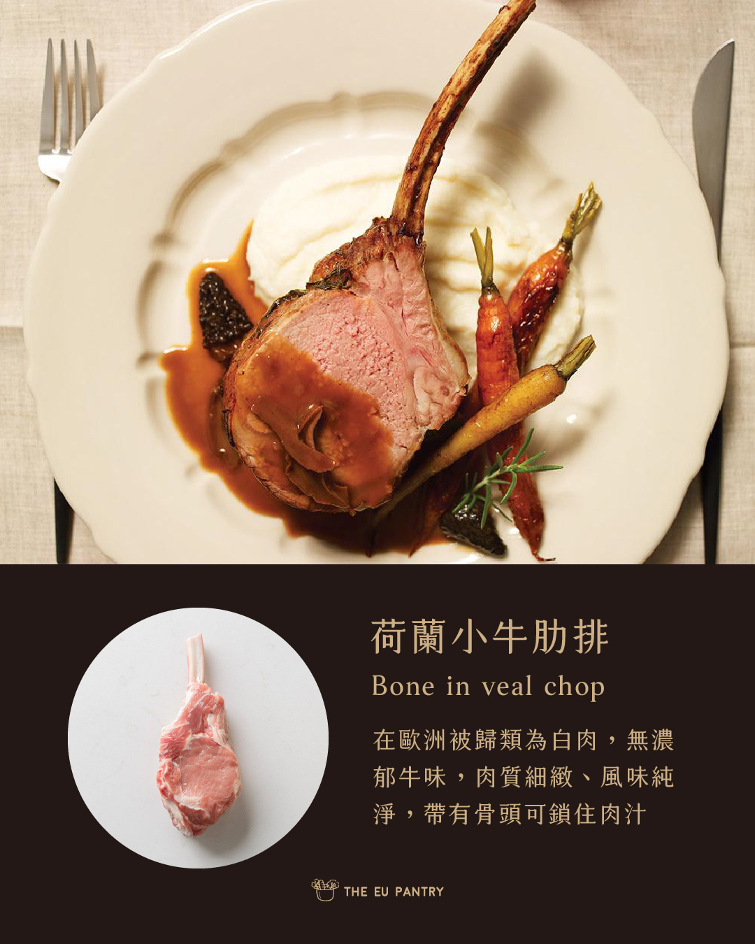 在歐洲被歸類為白肉,無濃郁牛味,肉質細風味純淨,帶有骨頭可鎖住肉汁