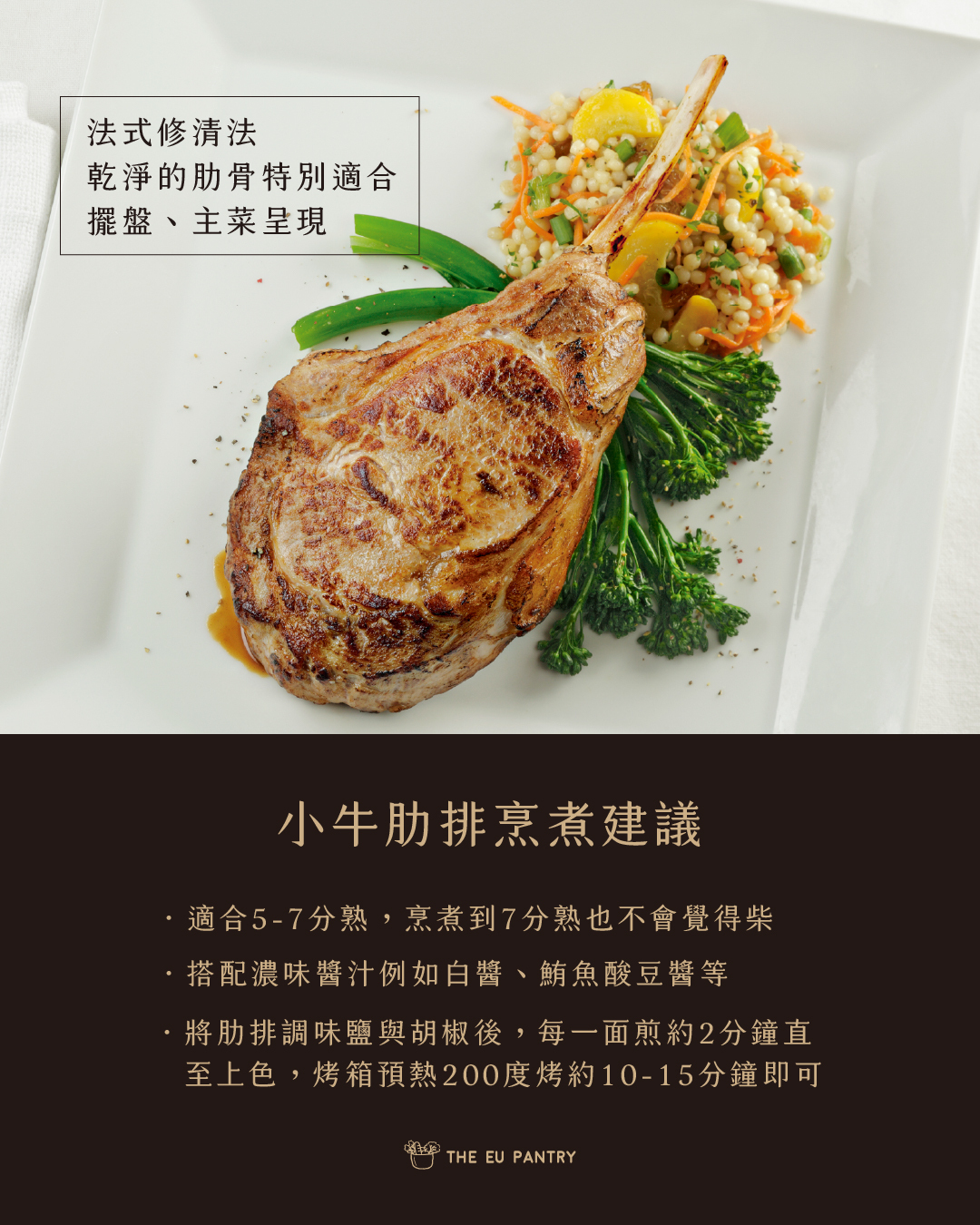 此產品為法式修清法,乾淨的肋骨特別適合擺盤、主菜呈現,因帶有骨頭,煎烤過程更可以鎖住肉汁,因此吃起來比一般里肌肉更多汁軟嫩,也可以在肋排快吃完時享受啃骨頭與骨仔肉的樂趣