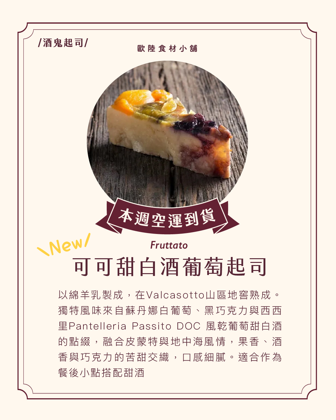 Beppino Occelli 全新限量版起司 ,「可可甜白酒葡萄起司 Fruttato」,以綿羊乳製成,在Valcasotto山區地窖熟成。獨特風味來自蘇丹娜白葡萄、黑巧克力與 西西里Pantelleria Passito DOC風乾葡萄甜白酒的點綴,融合皮蒙特與地中海風情,果香、酒香與巧克力的苦甜交織,口感細膩。適合作為餐後小點搭配甜酒,帶來獨特的味覺享受。