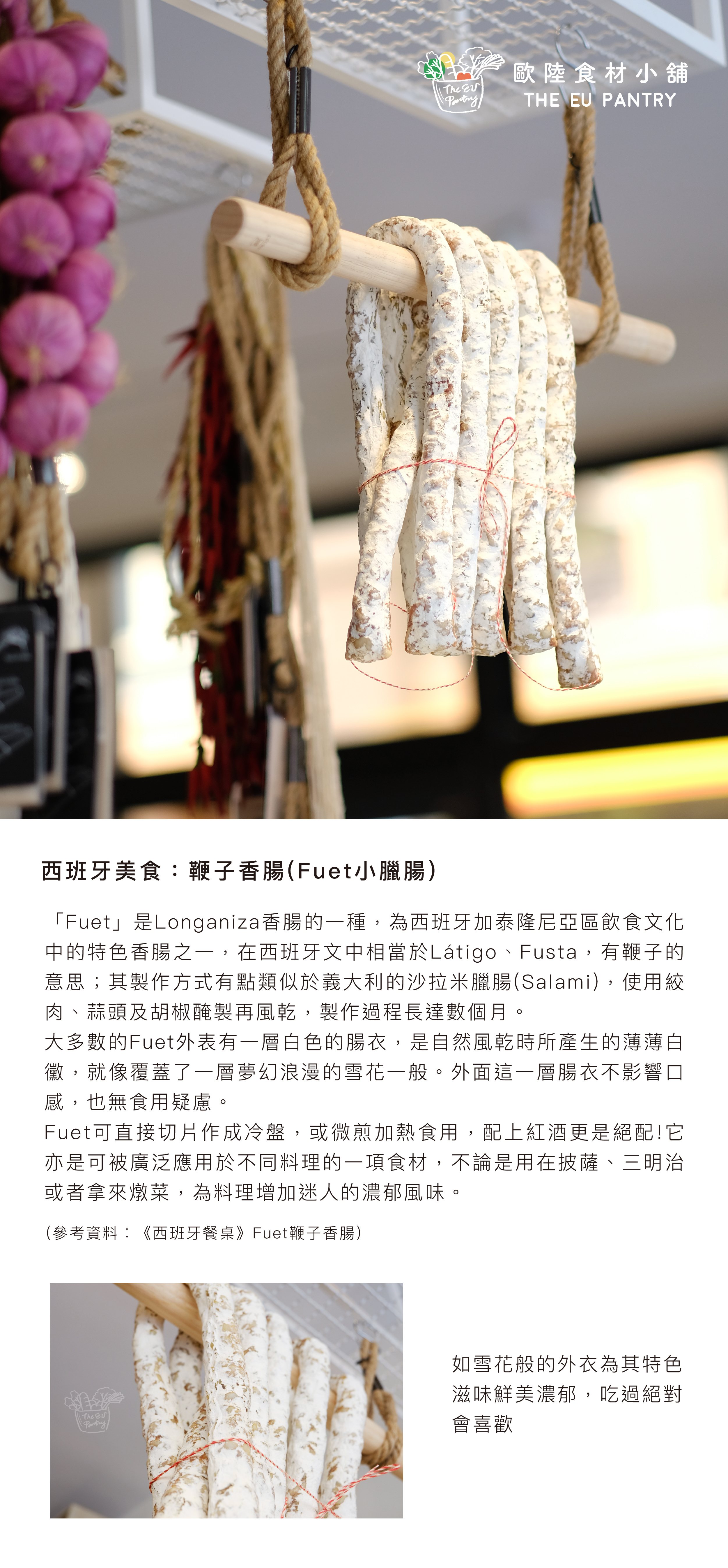 使用台灣豬在地生產歷時兩個月的熟成,自然風乾下腸衣佈上完美的白黴,咀嚼起來很甘甜且香氣十足