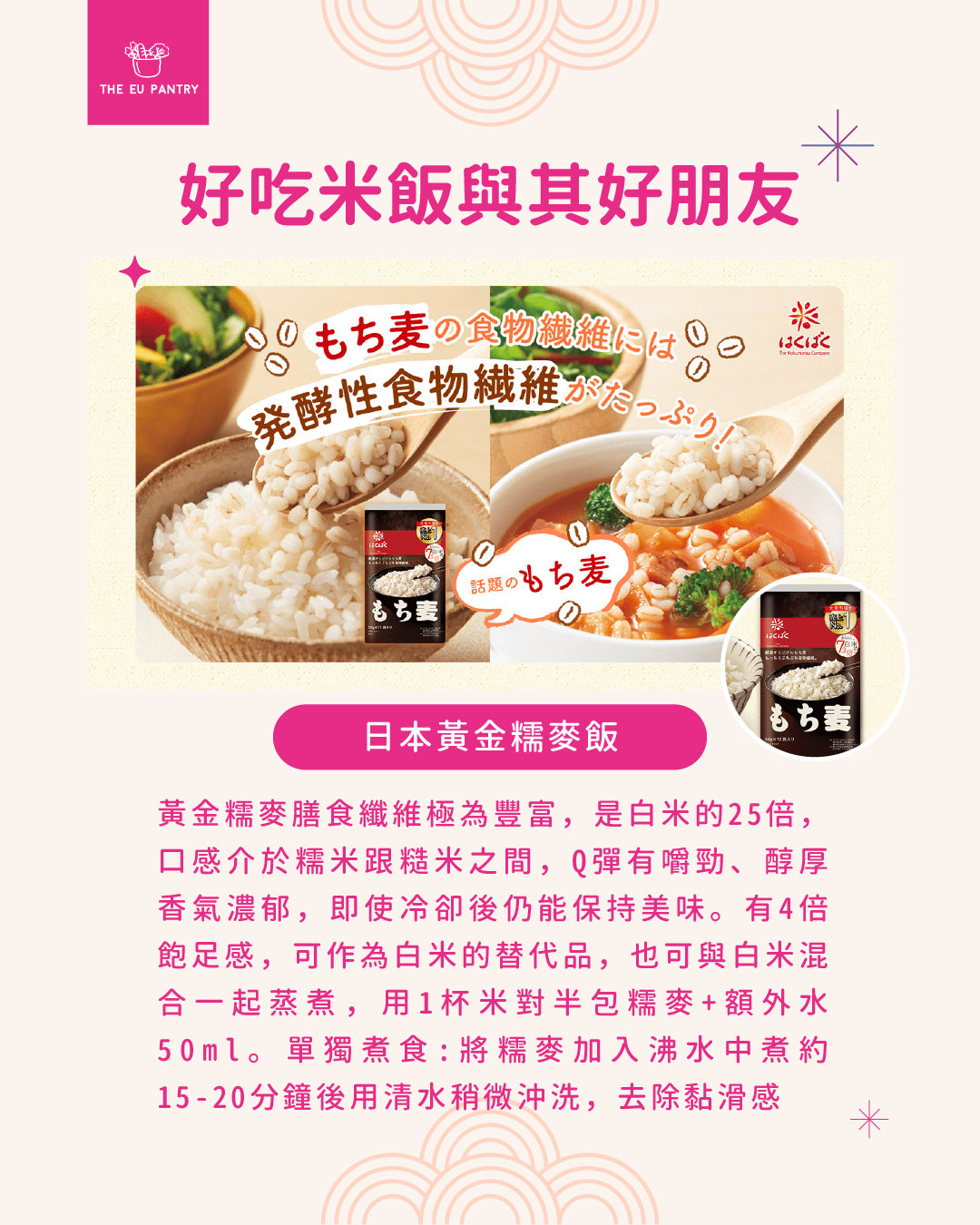總膳食纖維量是白米的25倍,醇厚香氣,口感介於糯米跟糙米之間,4倍飽足感,適合加入白米煮成日式麥飯。作法:用1杯米對半包糯麥+額外水50ml。單獨煮食:將糯麥加入沸水中煮約15-20分鐘後用清水稍微沖洗,可去除黏滑感