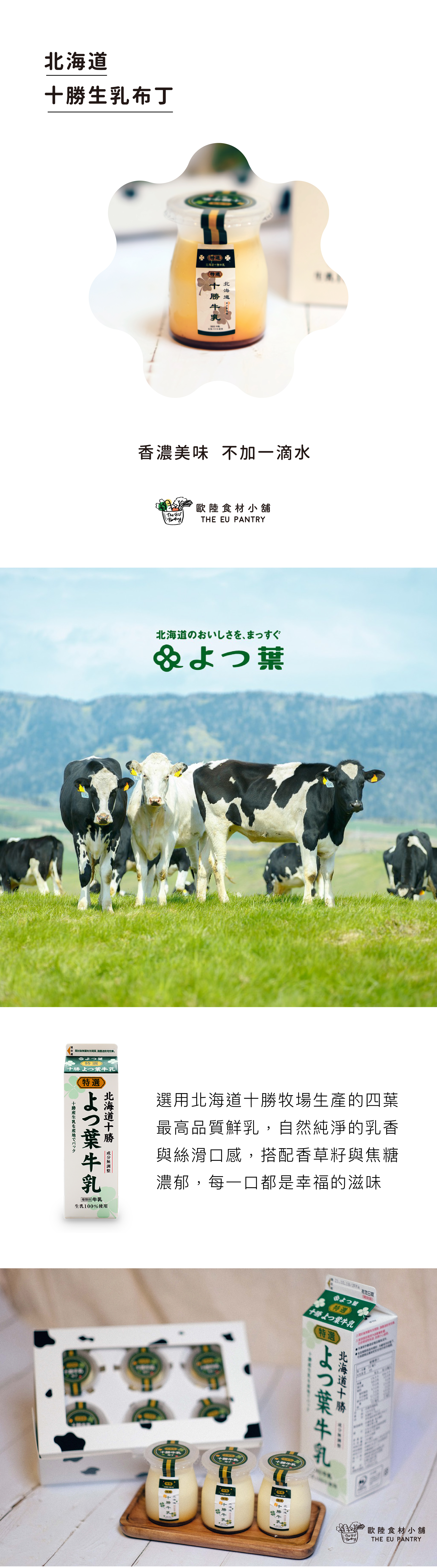 選用北海道十勝牧場生產的四葉最高品質鮮乳,自然純淨的乳香與絲滑口感,搭配香草籽與焦糖濃郁,每一口都是幸福的滋味