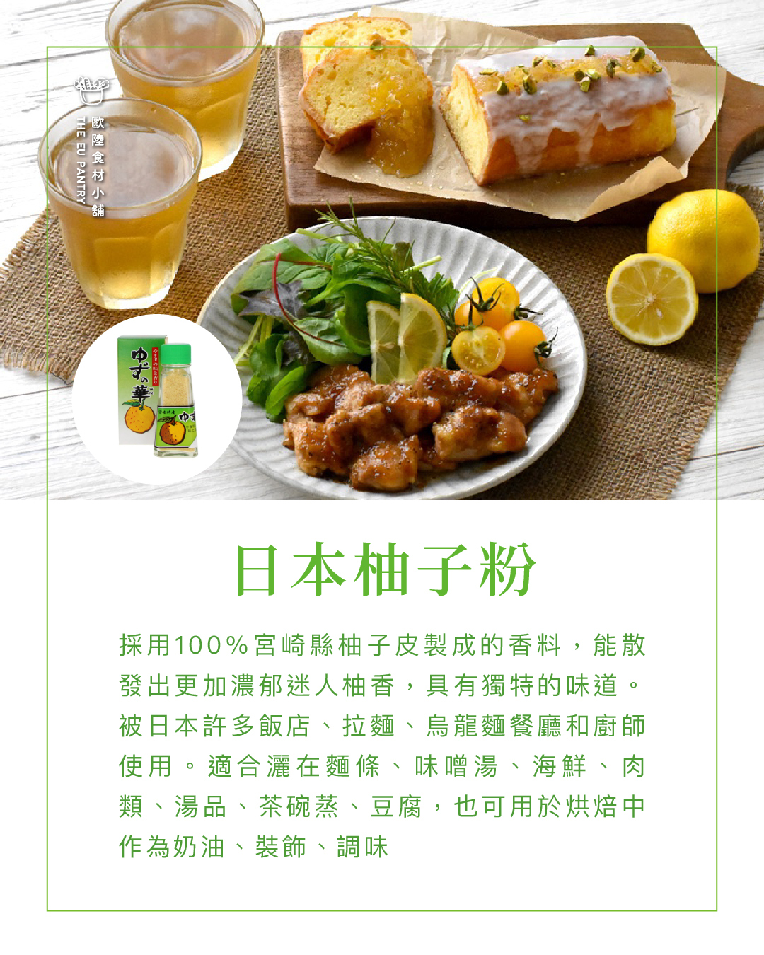 100%宮崎縣產柚子皮製成的芳香香料,能散發出更加濃郁迷人柚香。適合灑在麵條、味噌湯、海鮮肉類、湯品、茶碗蒸、豆腐,也可用於烘焙中作為奶油、裝飾、調味