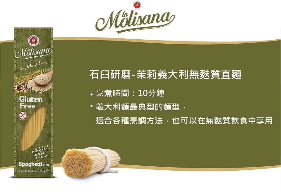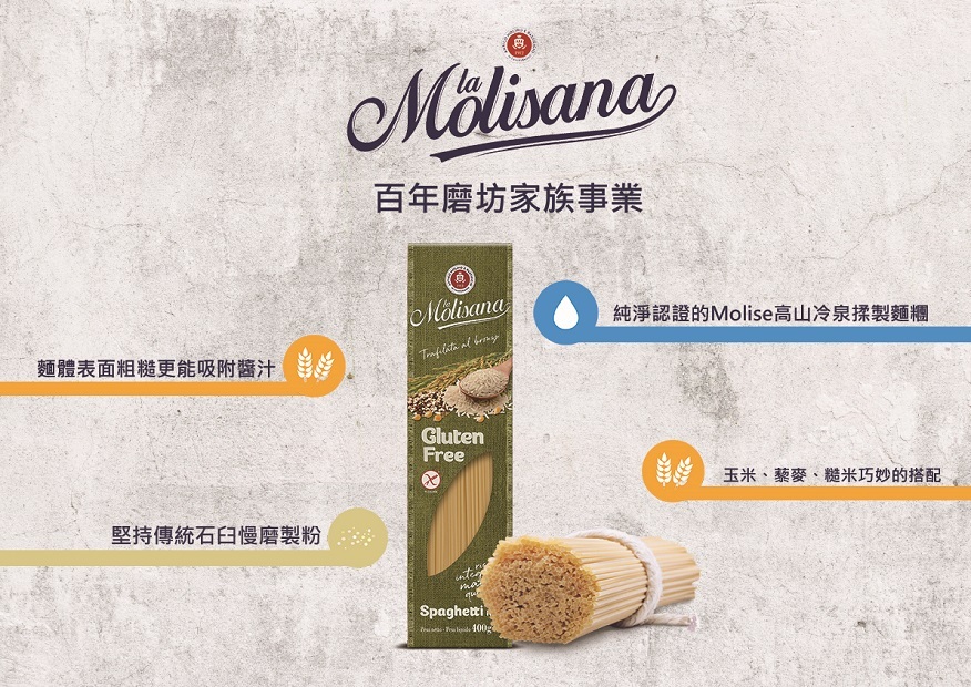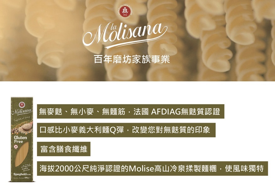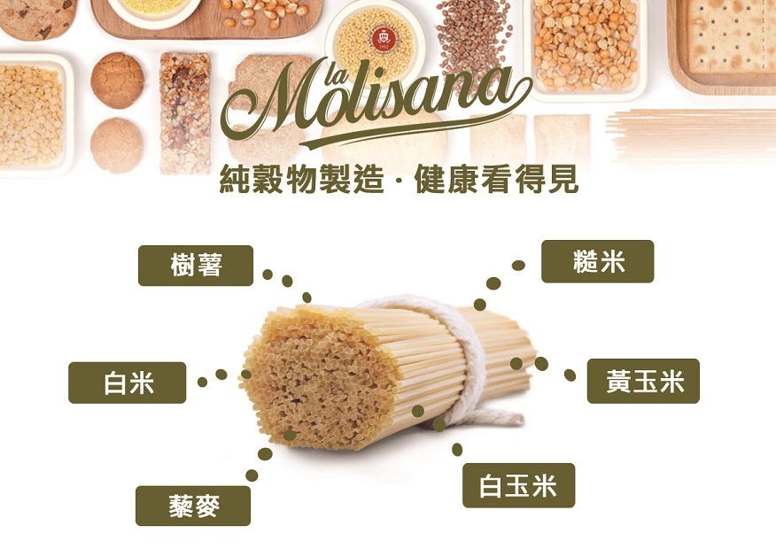 使用玉米、藜麥、糙米製作,無麥麩無小麥、無麵筋,口感比小麥義大利麵Q彈,富含膳食纖維,適合搭配各式醬汁