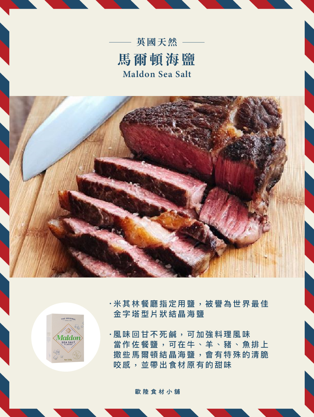 MALDON 馬爾頓天然海鹽 此鹽廠已有200年的歷史,其屹立不搖的秘訣在於追求高品質而不求量產,並仍使用手工採集與傳統工法,用心煉製出純淨且獨特的海鹽 100%天然的產品,不含任何的添加物,僅蘊含微量的海洋元素如鎂或鈣,並通過有機食品認證,會回甘不死鹹的味道,沒有一般鹽餘韻的苦味,能夠加強食材本身自然的特色,被譽為世界最佳"金字塔型片狀"結晶海鹽