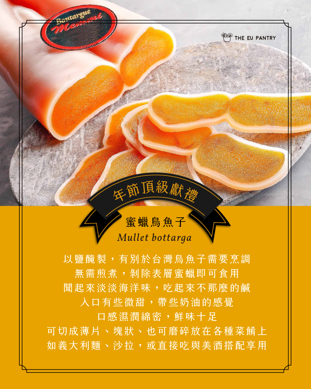 以金黃色天然蜜蠟包覆,低鹽醃製,降低鈉含量,有別於台灣烏魚子需要烹調,無需煎煮,剝除表層蜜蠟,切片即可與美酒搭配享用,聞起來淡淡海洋味,吃起來不那麼的鹹,入口有些微甜,帶些奶油的感覺,口感濕潤綿密,鮮味十足,過年餐桌上都要擺上一盤烏魚子,除了台灣傳統烏魚子,也試試有別於台灣風味的烏魚子吧