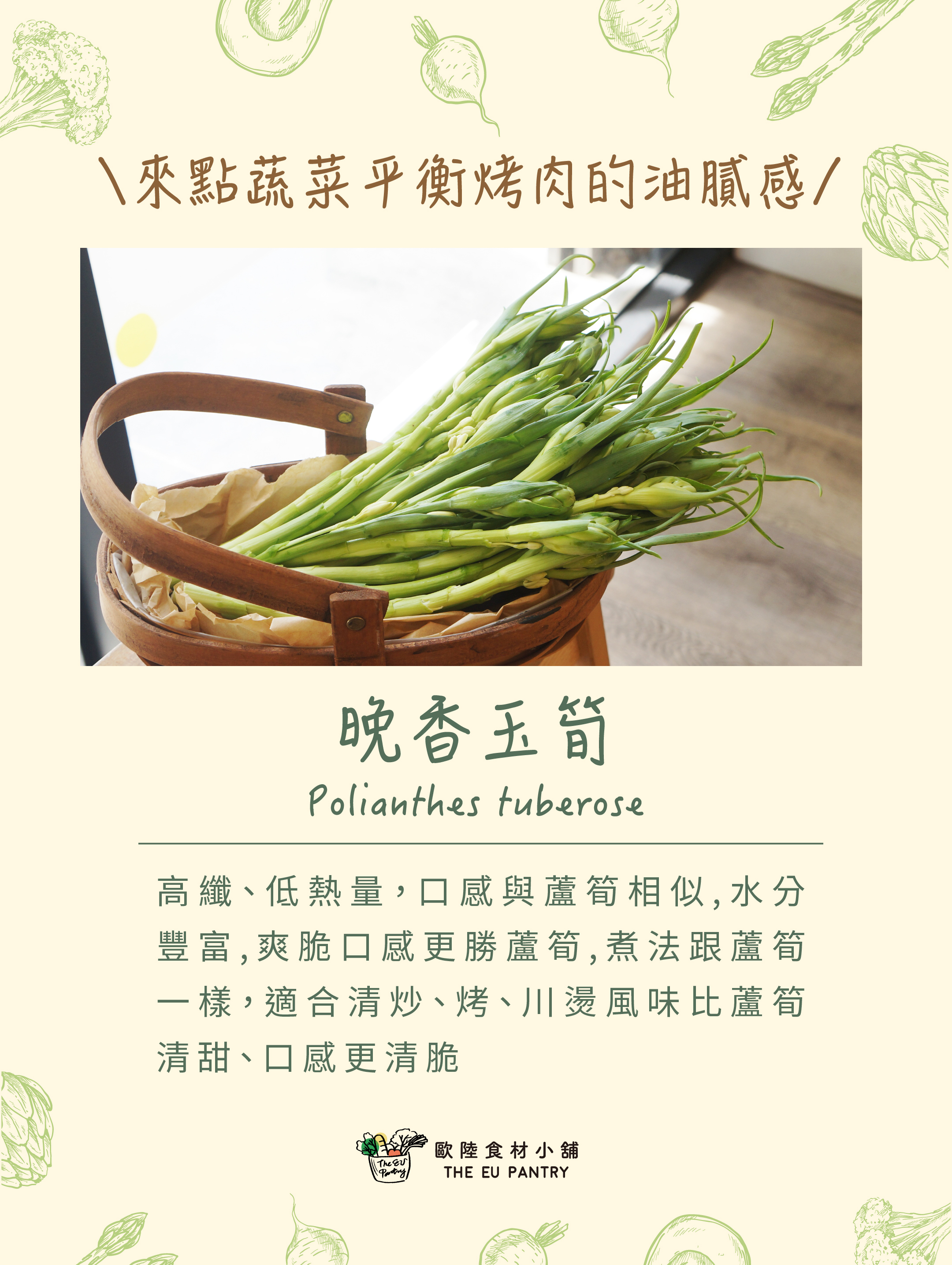 晚香玉筍為夜來香的花苞及花莖,整株可食用,煮法跟蘆筍一樣,適合清炒、烤、川燙風味比蘆筍清甜、口感更清脆