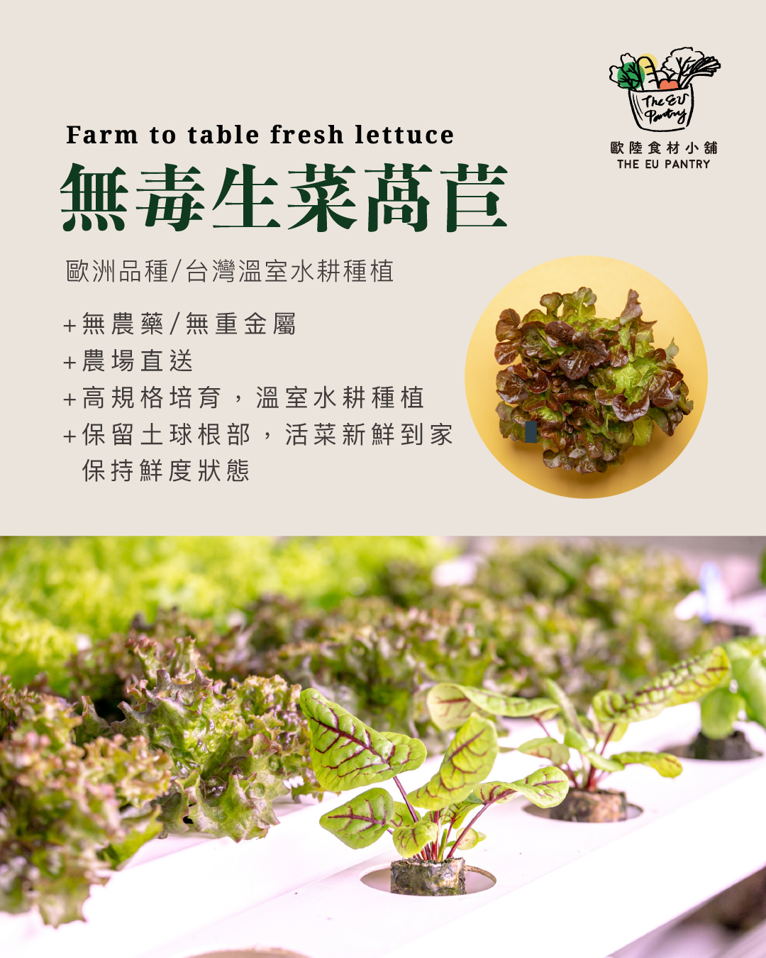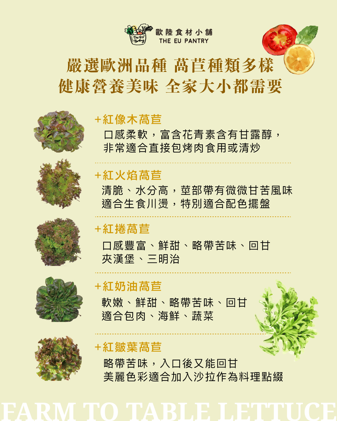 歐陸食材小舖每日精選農場新鮮直送生菜,生菜帶有莖與些許泥土,因為新鮮採收並未沖洗過可存放3-5天,收到生菜以後只要經過水洗即可食用,歡迎喜歡在家做生菜沙拉的朋友訂購美麗又健康美味的歐洲生菜