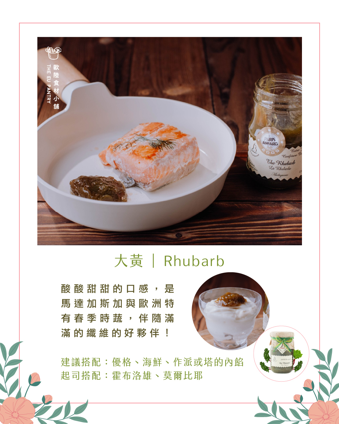 從法國移民到馬達加斯加西南 Vakinankaratra地區的大黃, 可以說是風土概念的經典範例,源自法文  Terroir  一詞的風土, 是指植物於不同的地區生長 ,會隨著地風不同的水土日照 ,而產生不同的特性,所以原本在歐洲是紅紫色,酸酸粗粗的大黃, 到了馬達加斯加變成了綠色,而且也變得更柔軟又和藹可親!這款果醬酸酸甜甜的口感 ,伴隨滿滿的纖維,是快樂補充每日膳食纖維的好夥伴!上法式風格的香料植物展現出全新的迷人風味。鳳梨的熱帶風味與香草的香甜和迷迭香的芳香完美平衡 ,完美地體現創辦人Brigitte的巧手與法國貴族家傳食譜的美妙。
