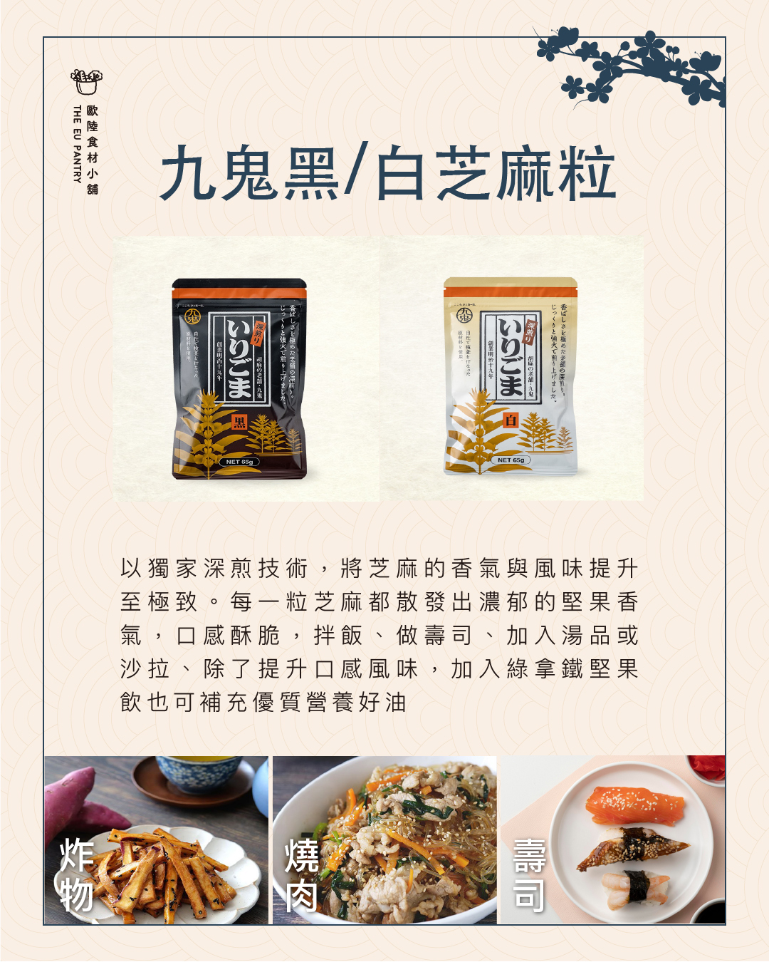 源自擁有120年以上歷史的日本知名老店。嚴選黑芝麻,以高溫強火煎製工藝烘焙而成,風味濃郁且口感豐富。無論是拌飯、做壽司,還是加入湯品或沙拉,都能增添誘人香氣,成為料理不可或缺的元素。