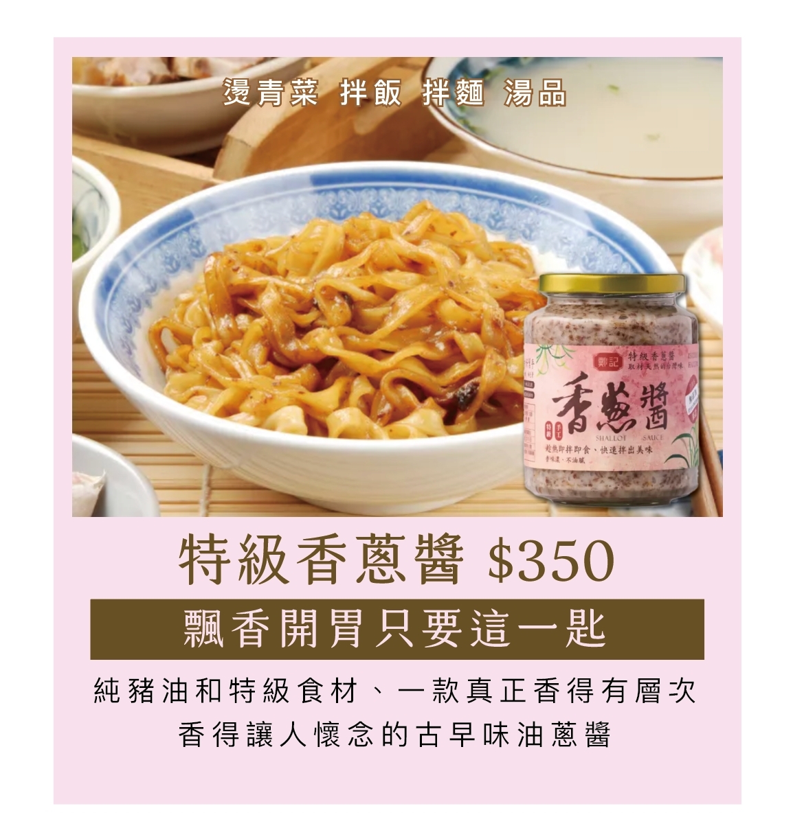 香蔥醬是一款超級強烈香氣的古早味油蔥,以古法及傳統手工精製而成。常用於麵食料理,不論炒菜、燙清菜、各種食物的調理,皆能立即增香提味。