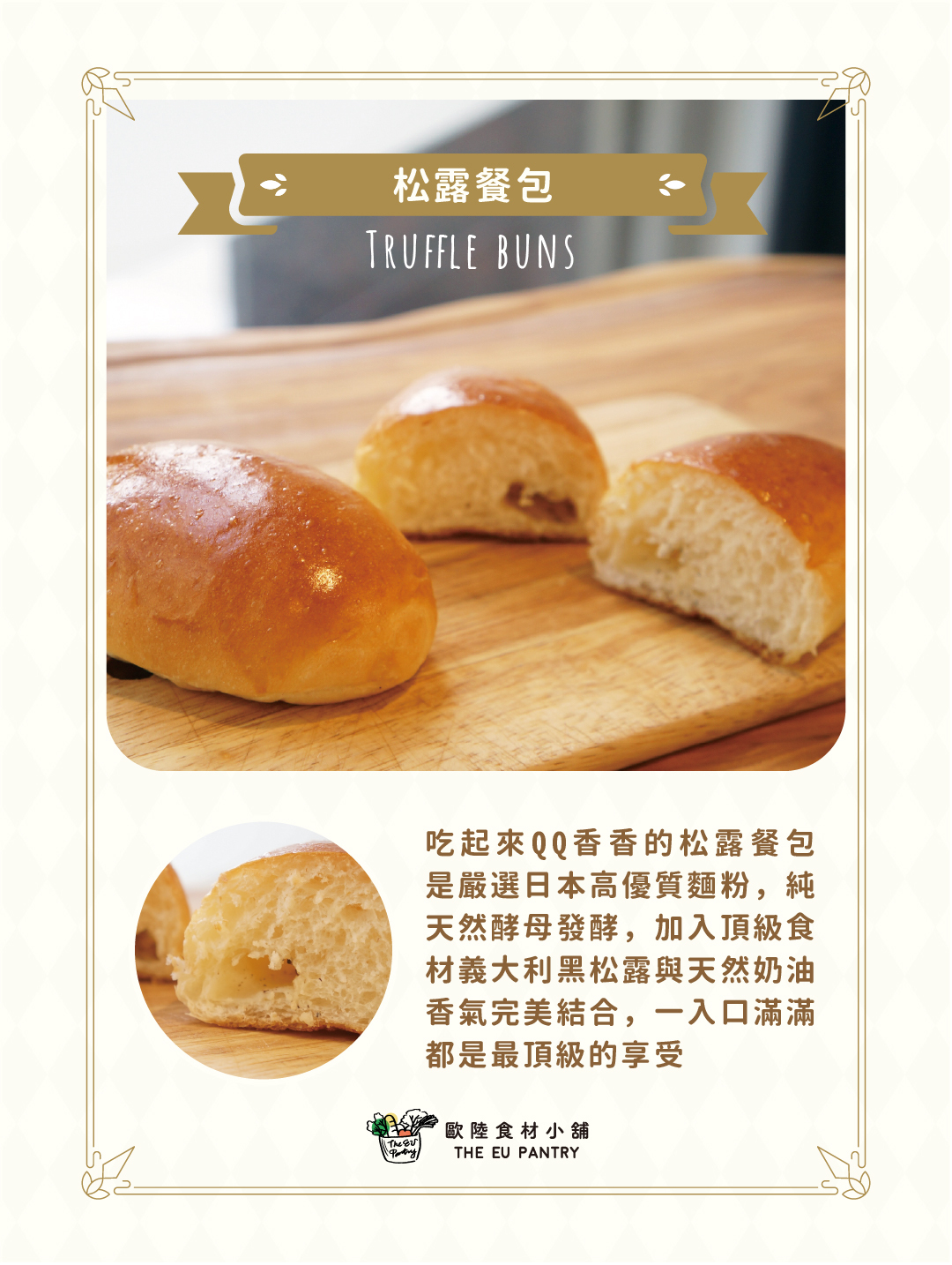 吃起來QQ香香的松露餐包是嚴選日本高優質麵粉,純天然酵母發酵,加入頂級食材義大利黑松露與天然奶油香氣完美結合,一入口滿滿都是最頂級的享受